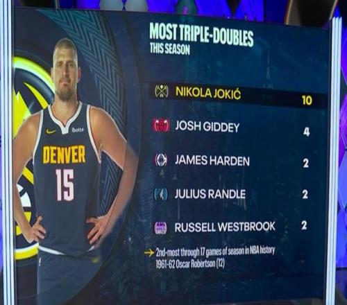 此外,约基奇的10次三双也领跑本赛季NBA的三双榜,比排名第二的约什-吉迪多出了6次。