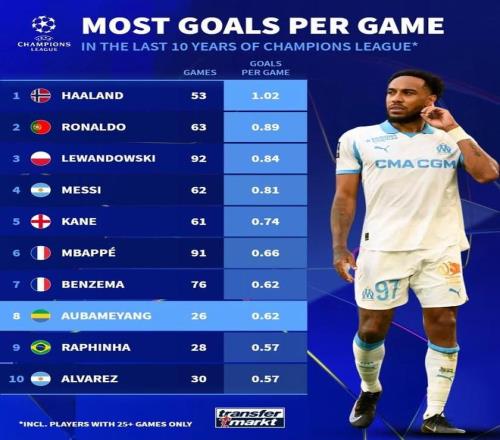 北京时间11月26日,德转统计出了近10年欧冠场均进球数排名前10的球员,哈兰德以场均1.02球高居第一,C罗0.89球第二,梅西0.81球第四,在本轮欧冠比赛中完成梅开二度的奥巴梅扬以0.62球位列第八位。
