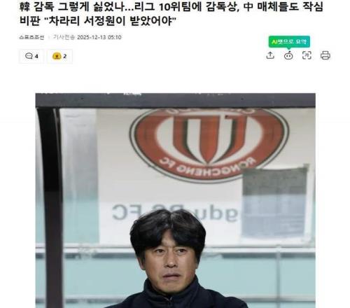 韩国媒体表示:徐正源本赛季带领成都蓉城最后还在争夺冠军,最终拿到第3名,没获得最佳教练太不合理,并上升到了中国足坛似乎对韩国籍教练有明显“亏待”,还举例说除了徐正源之外,之前把山东泰山打造成强队的崔康熙也几乎是被“赶走”的,带重庆冲超的张外龙也没能完成续约。