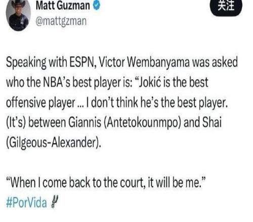 话说现在的文班亚马不仅充满攻击性,还相当自信爆棚,之前接受采访时表示约基奇是最好的进攻球员可不是联盟最佳,字母哥和亚历山大可以竞争第一人,不过等到自己回归之后联盟最佳就会易主。